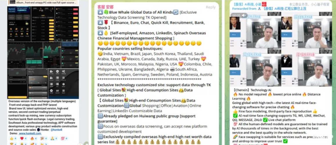 汇旺担保的商家提供各种服务,包括开发用于“猪盘”骗局的加密货币投资网站(左图)、提供全球个人数据以便骗子针对性诈骗(中图),以及广告中用于诈骗的AI变脸软件(右图)。