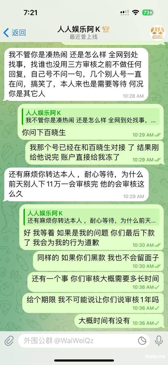 事情的起因是我在金贝公群频道 看到挂着直营盘 人人娱乐 于是便上了8万u 拉pg电子 拉到10万u下分 一天消息过去了 客服不处理下款 于是我便找到熊猫哥 询问情况 熊猫说金贝和人人没用关系 频道只是广告忘记下 于是便询问人人股东 他们股东说 我的账号有疑似团队作案 刷分行为 再排查 (我本人这2万u的盈利 均为正常游戏 可以找任何第3方机构检测)后来在别人的介绍下 我又联系到另外一位 (百晓生)说可以帮忙 于是我便提供账号 聊天记录给他 现在我的账号全部登不上去 客服也把聊天记录双清