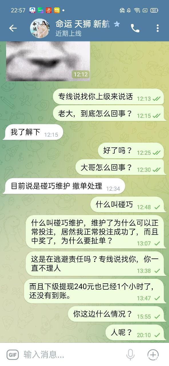 本人今年3月份在天狮娱乐打新澳门六合彩亏了8万,8月13号登陆平台账号有130块钱玩了一下平台的奇趣腾讯qq分分彩,买了三星复式单挑中奖了,差不多奖金九千多,平台直接给我撤单,找了专线和上级,专线和上级都说是碰巧维护,我投注的时候没有维护正常下注的。结果中奖了平台给我来了句,碰巧维护撤单处理,我要求平台给我奖金,不但不给反而把我账号给冻结了。大家记住天狮这个杀猪盘,只能输不能赢,中奖就撤单,而且冻结账号。希望有高层出来处理这个问题,黑了九千多块钱,如果没人才处理,就一直曝光,曝光到你们有人出来处理。
