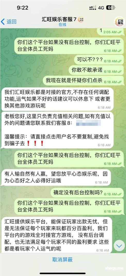 史上最黑平台汇旺娱乐,只会套着你的本金打!比如你输1000给你吐800,然后你再冲再吃你。大家一定要避坑。。。 千万不要玩儿,这个平台绝对后台控制的。。 刚才与客服互怼的时候,他发了一句:我就是能控制,你拿我怎么样 但是他秒删除。 我估计应该是把这句话放在输入框,截图给他同事开玩笑,不小心发出来了。 请各位还在玩儿线上娱乐的朋友注意。
