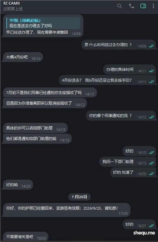 7月19日公司RZ部门 RZCAMII同事联系我说收到了离职申请,目前我的护照办理9G中离职了要把我的9G撤回 我问什么时间送过去办理回复我4月份, 说7月初同事通知我去按指纹 而我接到消息都7月11日了