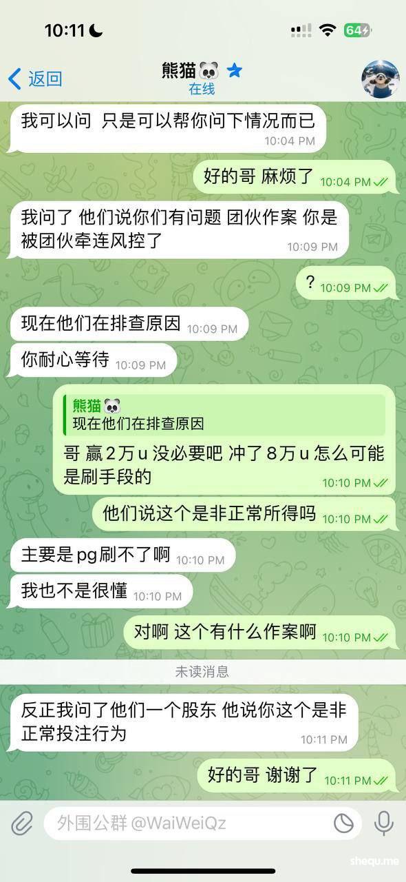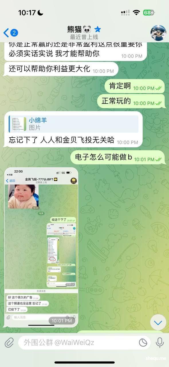 事情的起因是我在金贝公群频道 看到挂着直营盘 人人娱乐 于是便上了8万u 拉pg电子 拉到10万u下分 一天消息过去了 客服不处理下款 于是我便找到熊猫哥 询问情况 熊猫说金贝和人人没用关系 频道只是广告忘记下 于是便询问人人股东 他们股东说 我的账号有疑似团队作案 刷分行为 再排查 (我本人这2万u的盈利 均为正常游戏 可以找任何第3方机构检测)后来在别人的介绍下 我又联系到另外一位 (百晓生)说可以帮忙 于是我便提供账号 聊天记录给他 现在我的账号全部登不上去 客服也把聊天记录双清